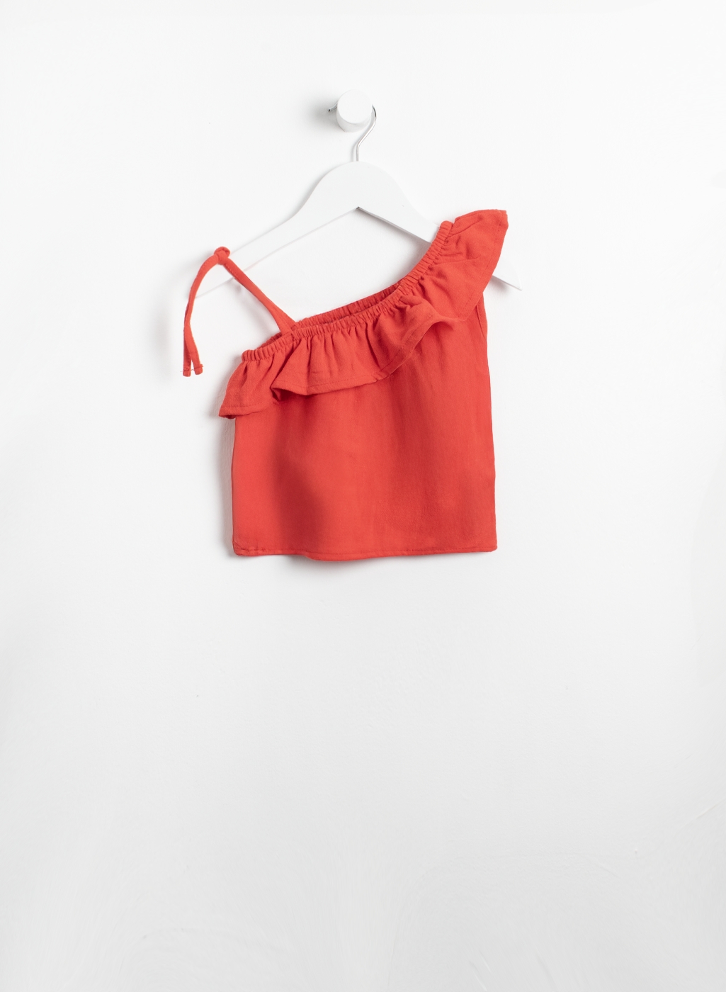 Blusa lisa con escote asimétrico. Con volado en un hombro y en el otro tiritas para anudar.