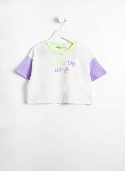 Remera básica, mangas ranglan a contracolor; con estampa delantera.
