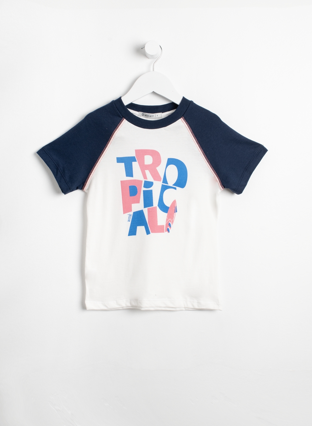 Remera básica, mangas ranglan a contracolor; con estampa delantera.