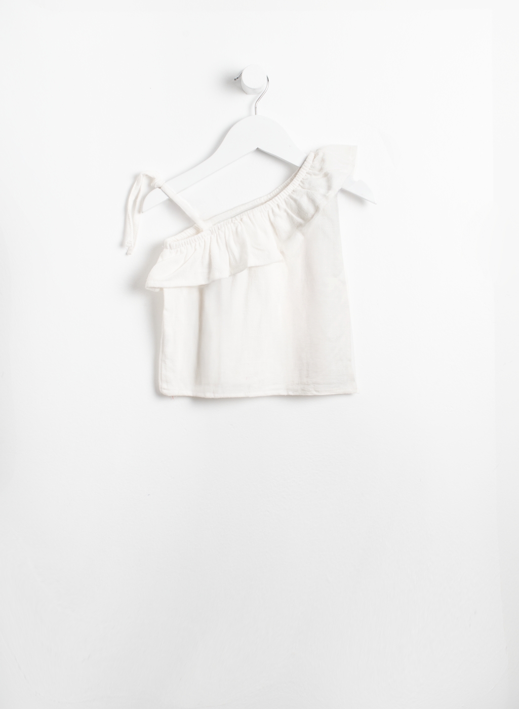 Blusa lisa con escote asimétrico. Con volado en un hombro y en el otro tiritas para anudar.