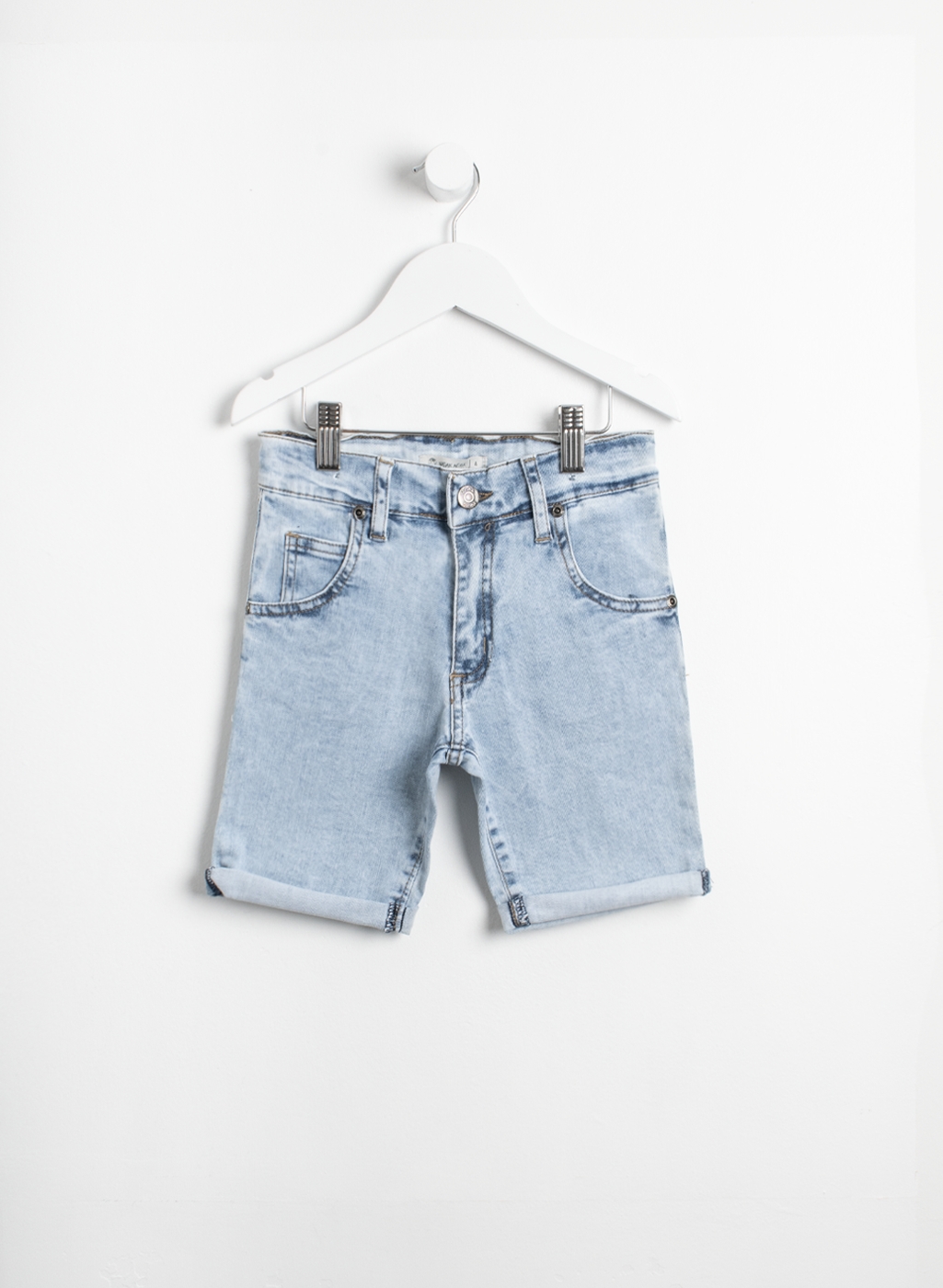 Bermuda de denim con bolsillos en ruedo. Con elástico regulable en la cintura.